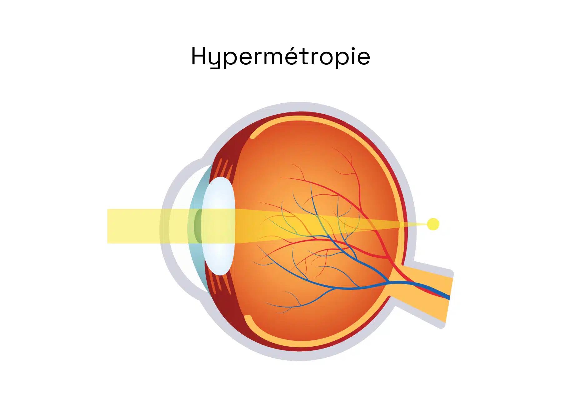 L’hypermétropie, également appelée hyperopie, est un trouble de la réfraction oculaire où la lumière ne se focalise pas correctement sur la rétine, mais en arrière de celle-ci. Cela est souvent dû à une longueur insuffisante du globe oculaire ou à une courbure trop faible de la cornée, empêchant une vision nette des objets rapprochés, tandis que la vision de loin reste généralement claire.